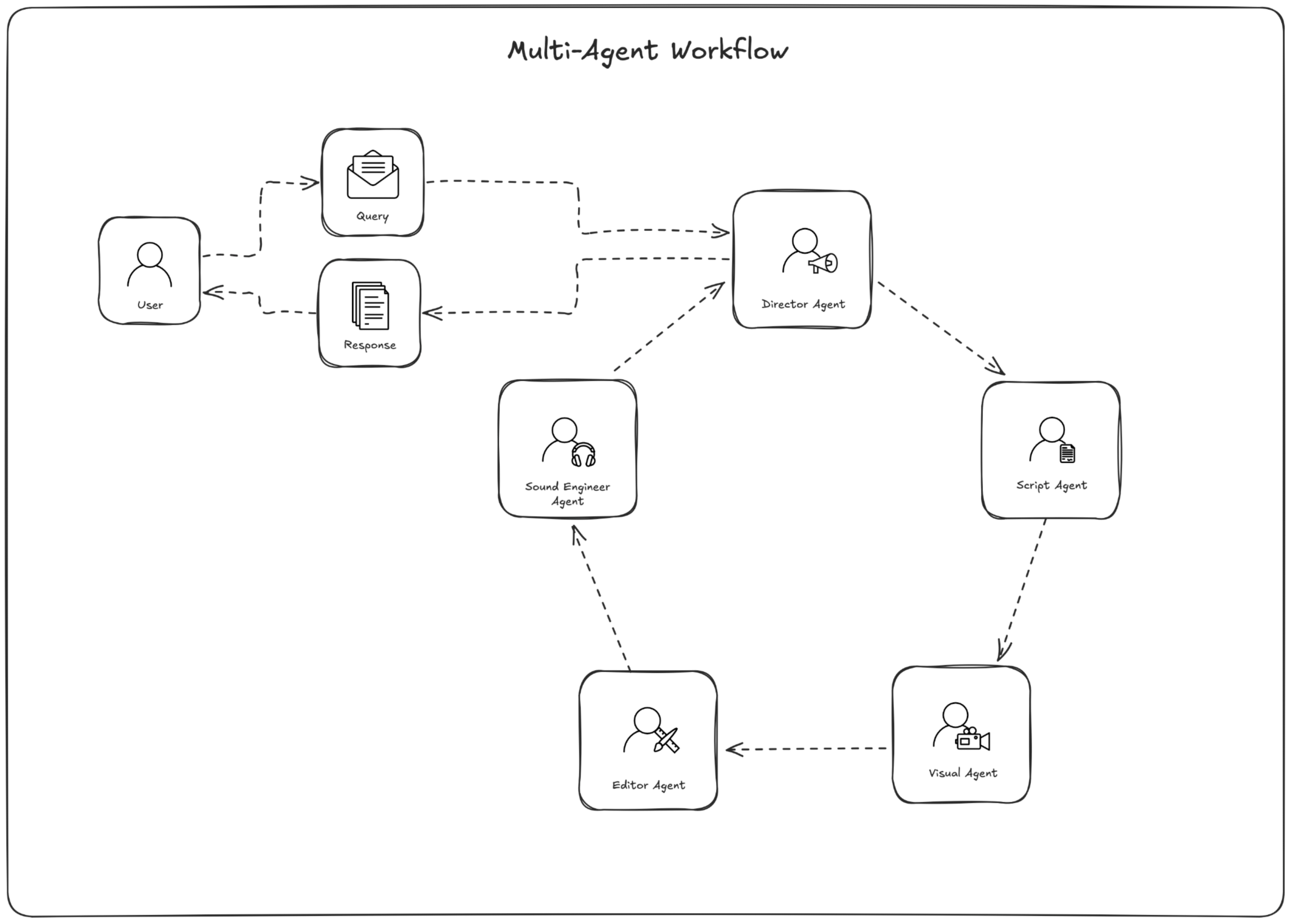 This workflow shows how multiple AI agents, each with a specific capability, can collaborate to achieve a common goal, in this case, producing a promotional video. Each agent handles a focused task, such as writing, generating visuals, or editing content. Through structured coordination and information sharing, the agents work together to turn the producer’s request into a complete and coherent final product.